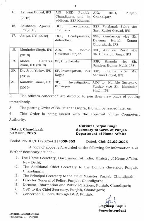 Punjab media news ; पंजाब पुलिस में बड़ा फेरबदल होने की सूचना है। बताया जा रहा है कि पंजाब सरकार ने जालंधर पुलिस कमिश्नर स्वप्न शर्मा सहित 21 आई.पी.एस. अधिकारियों का तबादला कर दिया है। पुलिस में कुल 21 पुलिस अफसरों का तबादला किया गया है, जिसमें 2 नए डीआईजी लगाए गए हैं। जालंधर में अब आई.पी.एस.अधिकारी धनप्रीत कौर को कमान सौंपी गई है वहीं स्वप्न शर्मा को फिरोजपुर रेंज डीआईजी लगाया गया है। 21 अधिकारियों के तबादलों में 9 जिलों के एस.एस.पी. भी बदले गए हैं, जिनमें एस.एस.पी. होशियारपुर सुरेंद्र लांबा, एस.एस.पी. अमृतसर रूरल चरणजीत सिंह, एस .एस.पी. गुरदासपुर दयामा हरीश कुमार ओमप्रकाश, एस .एस.एस.पी. फिरोजपुर सौम्या मिश्रा, एस .एस.पी. बरनाला संदीप कुमार मलिक, एस.एस.पी. फतेहगढ़ साहिब रवजोत ग्रेवाल व एस.एस.पी. लुधियाना रुरल नवनीत सिंह बैंस के नाम शामिल हैं।