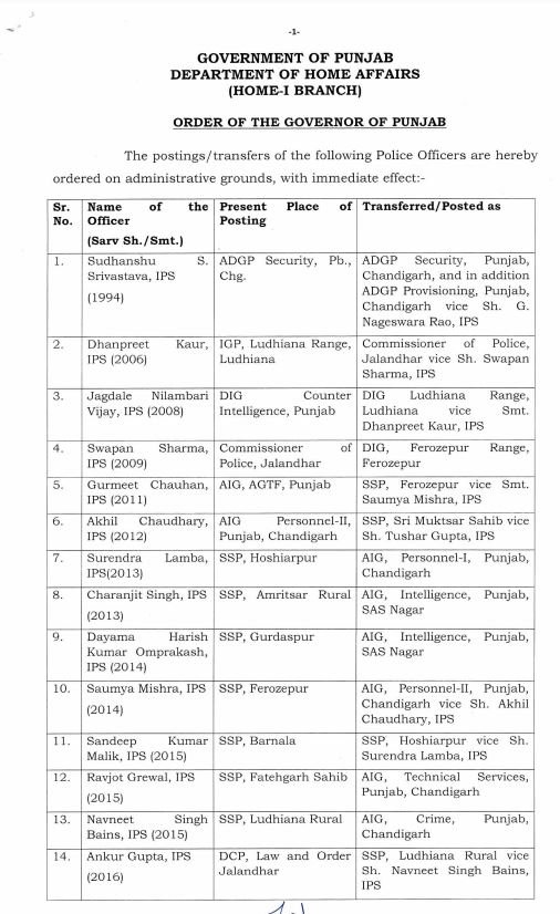 Punjab media news ; पंजाब पुलिस में बड़ा फेरबदल होने की सूचना है। बताया जा रहा है कि पंजाब सरकार ने जालंधर पुलिस कमिश्नर स्वप्न शर्मा सहित 21 आई.पी.एस. अधिकारियों का तबादला कर दिया है। पुलिस में कुल 21 पुलिस अफसरों का तबादला किया गया है, जिसमें 2 नए डीआईजी लगाए गए हैं। जालंधर में अब आई.पी.एस.अधिकारी धनप्रीत कौर को कमान सौंपी गई है वहीं स्वप्न शर्मा को फिरोजपुर रेंज डीआईजी लगाया गया है। 21 अधिकारियों के तबादलों में 9 जिलों के एस.एस.पी. भी बदले गए हैं, जिनमें एस.एस.पी. होशियारपुर सुरेंद्र लांबा, एस.एस.पी. अमृतसर रूरल चरणजीत सिंह, एस .एस.पी. गुरदासपुर दयामा हरीश कुमार ओमप्रकाश, एस .एस.एस.पी. फिरोजपुर सौम्या मिश्रा, एस .एस.पी. बरनाला संदीप कुमार मलिक, एस.एस.पी. फतेहगढ़ साहिब रवजोत ग्रेवाल व एस.एस.पी. लुधियाना रुरल नवनीत सिंह बैंस के नाम शामिल हैं।