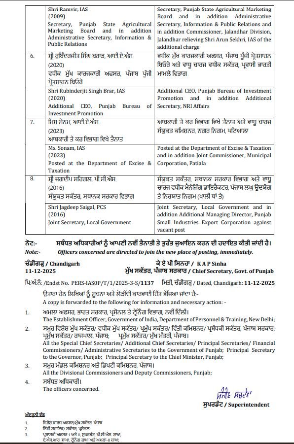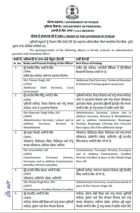 Punjab media news : पंजाब सरकार में तबादले लगातार जारी है। जानकारी अनुसार पंजाब सरकार द्वारा आज 8 अधिकारियों की ट्रांसफर कर नई तैनातियां की गई हैं, जिनमें आई.ए.एस. व पी.सी.एस. अधिकारी शामिल है। जिन अधिकारियों की ट्रांसफर की गई है, उनमें आई.ए.एस. तेजवीर सिंह, मनवेश सिंह सिद्धू, अरुण सेखड़ी तथा अन्य अधिकारी शामिल हैं। अतः जिन अधिकारियों के तबादले किए गए हैं, उनके नामों की लिस्ट निम्न है।