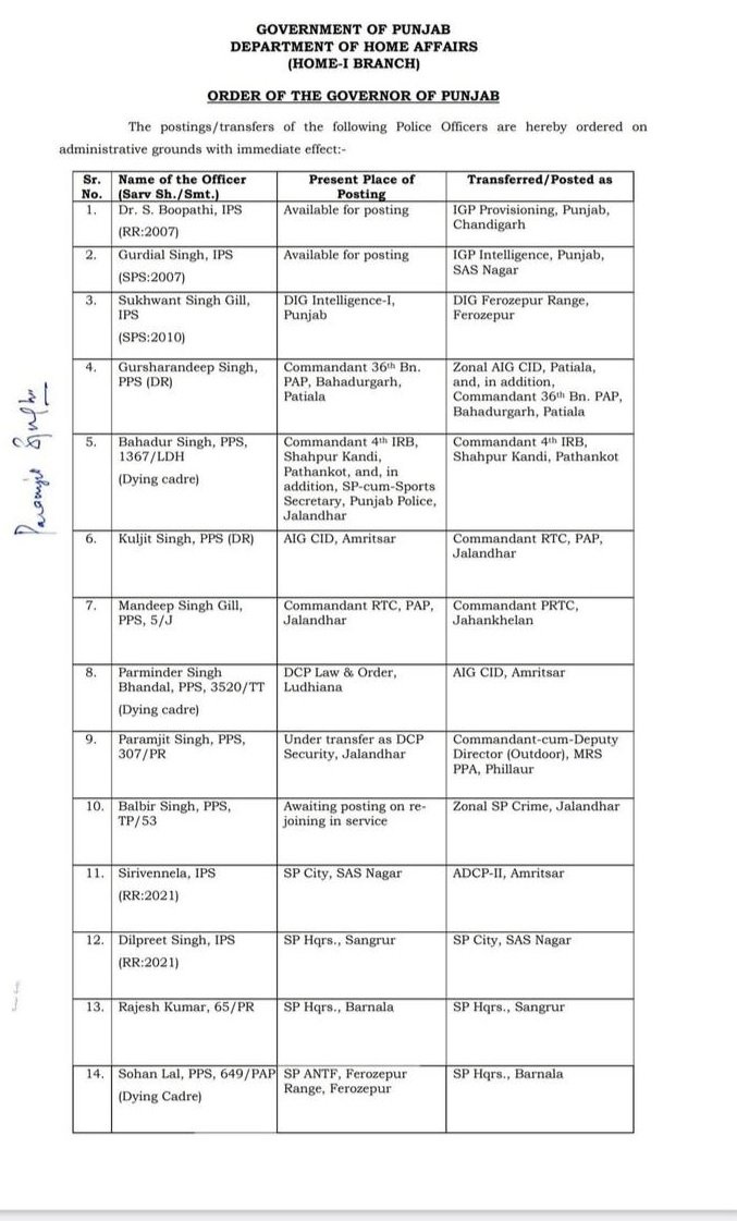Punjab media news : पंजाब में एक बार फेरबदल की खबर मिली है। जानकारी के अनुसार पंजाब सराकर ने IPS/PPS अधिकारियों के तबादलें किए हैं। सरकार के आदेशों पर 52 अधिकारियों का तबादला किया गया है। इनमें मोहित कुमार अग्रवाल, सुखविंदर सिंह गिल, गुरदयाल सिंह, गुरशरनदीप सिंह, राजेश कुमार और सोहन लाल सहित अन्य अधिकारी शामिल हैं। ट्रांसफर हुए अधिकारियों में 3 IPS और 49 PPS अधिकारी शामिल हैं, जिनकी सूची निम्नलिखित है: