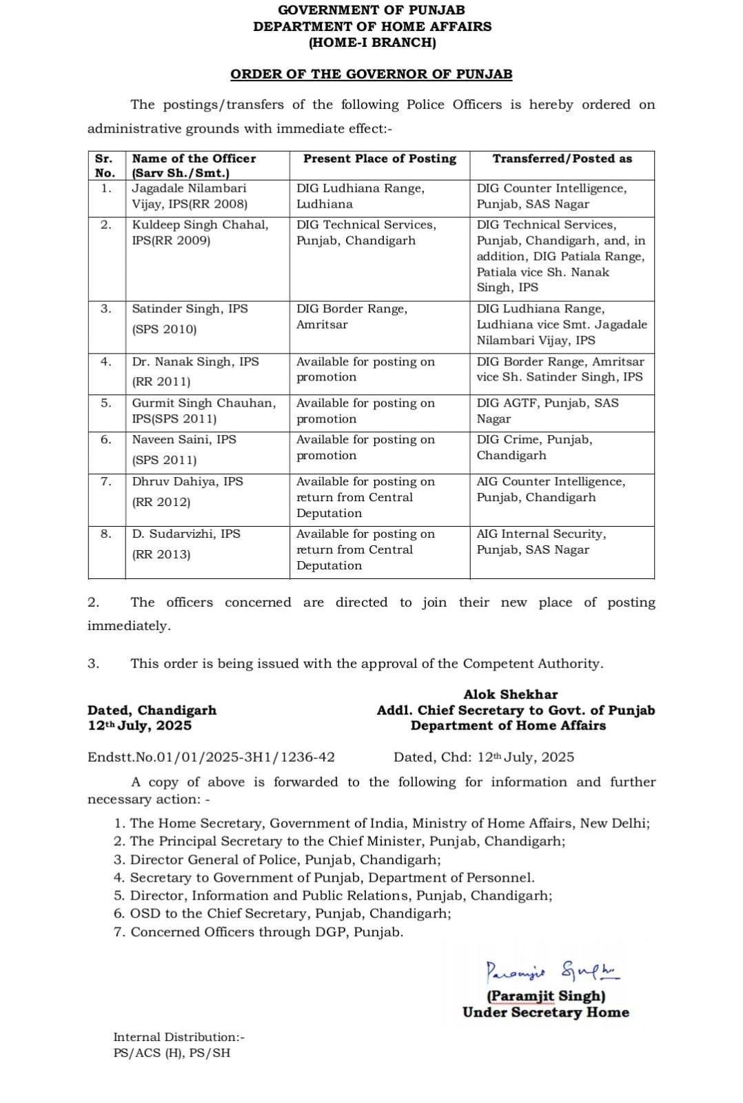 Punjab media news : पंजाब सरकार द्वारा फेरबदल का दौर लगातार जारी है। इसी बीच एक बार फिर सरकार ने पुलिस विभाग में फेरबदल किया है। जारी हुई सूची के मुताबिक, DIG रैंक के 8 सीनियर अधिकारियों को तबादले व नई तैनातियां की गई है। जारी हुई इन आदेशों को तुरन्त लागू करने के लिए कहा गया है। सूची के मुताबिक, नीलांबरी विजय जगदाले, कुलदीप सिंह चहल, सतिंदर सिंह, गुरमीत सिंह चौहान, ध्रूव दहिया, नवीन सैनी, डी. सुदरविझी, डॉ. नानक सिंह के तबादले हुए हैं।
